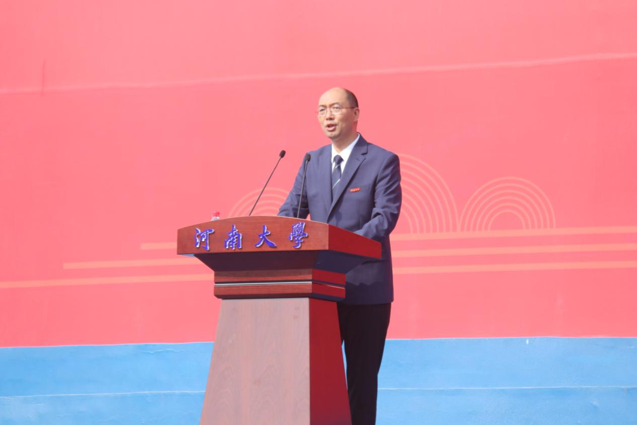 教师代表李云河发言。他分享了自身的有趣经历,告诫同学们要提升自我认知,探索自身的兴趣和价值观,做好人生规划;提升独立思考的能力,坚持自己的观点,培养创新精神。他祝愿同学们在河南大学这个广阔自由的大舞台书写出无悔的青春,奔赴美好的前程。