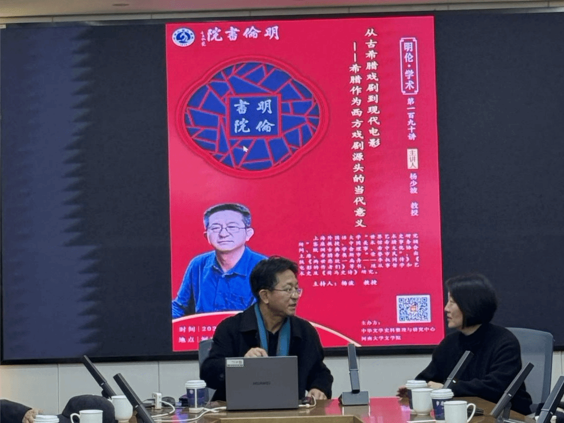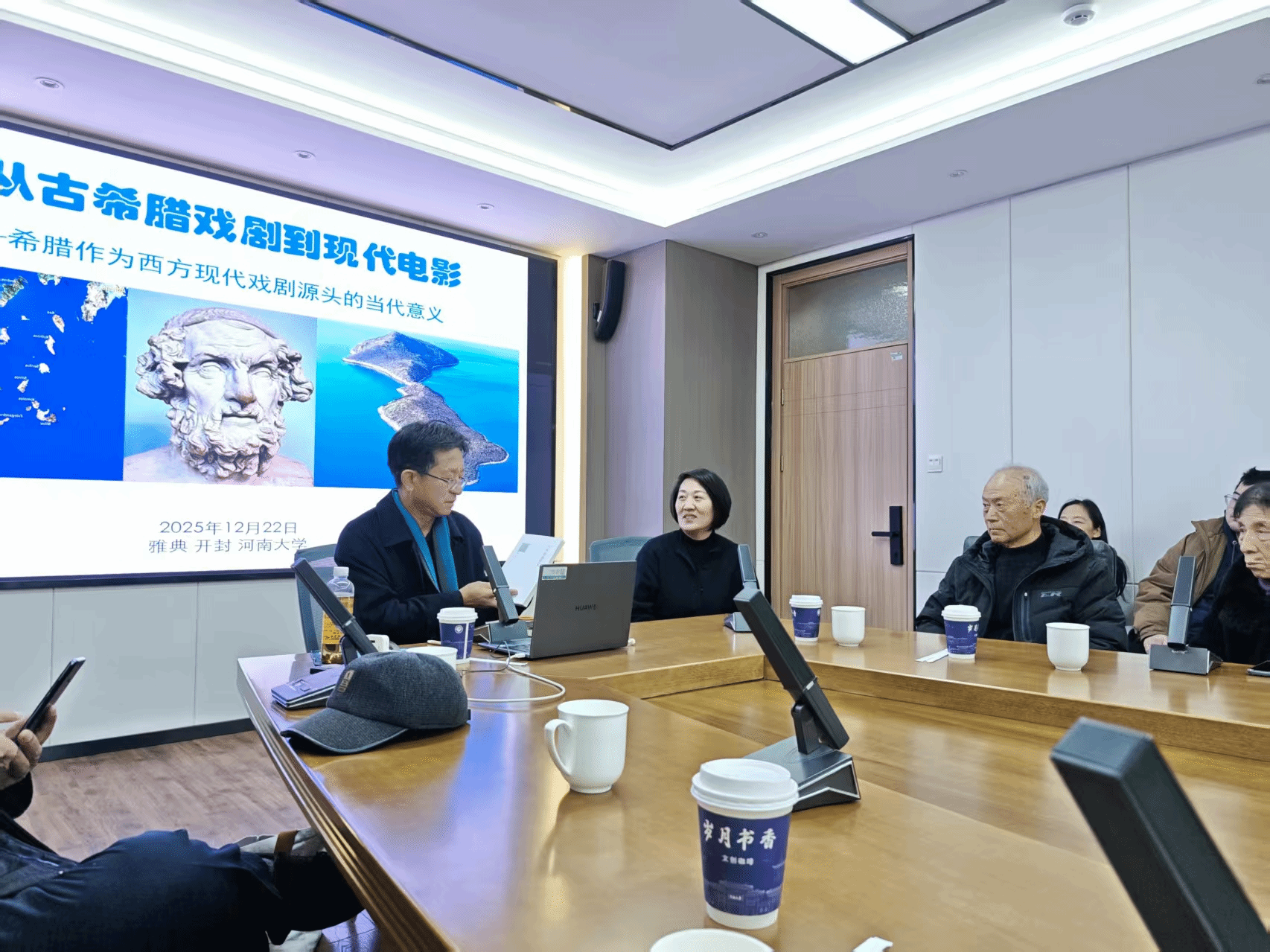 12月22日下午,上海外国语大学“世界艺术史研究所”客座教授、中国美术馆希腊事务顾问、欧洲古典学会理事、希中文化协会主席杨少波教授受邀为河南大学文学院戏剧与影视学专业研究生作“从古希腊戏剧到现代电影——希腊作为西方戏剧源头的当代意义”专题学术讲座。本次讲座由文学院知名教授、史铁生研究专家胡山林教授主持,作家、学者赵国栋先生,戏剧影视文学教研室主任孙振虎与副教授郭伟参与对谈。