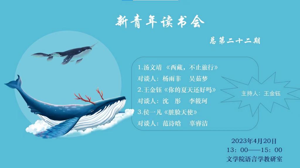 4月20日下午,文学院2021级3班于学院二楼语言学教研室举办第二十二期“新青年读书会”。本次读书会采用对谈形式,王金钰同学担任读书会主持人。3班全体同学及班主任鲁冰积极参加本次读书交流会。