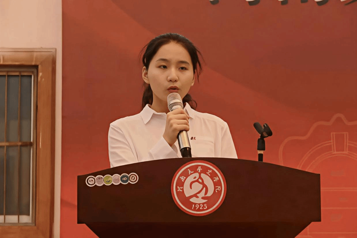 2025级中国语言文学类专业本科生代表秦舒婷发言。她回顾入学以来迎新、军训、歌咏比赛等精彩瞬间,希望自己能同所有新生一起,永葆专注心、激发好奇心、涵养赤子心。并郑重承诺,自觉担负起接续文脉、书写新篇的使命,不负时代,不负韶光,共赴光明前程。