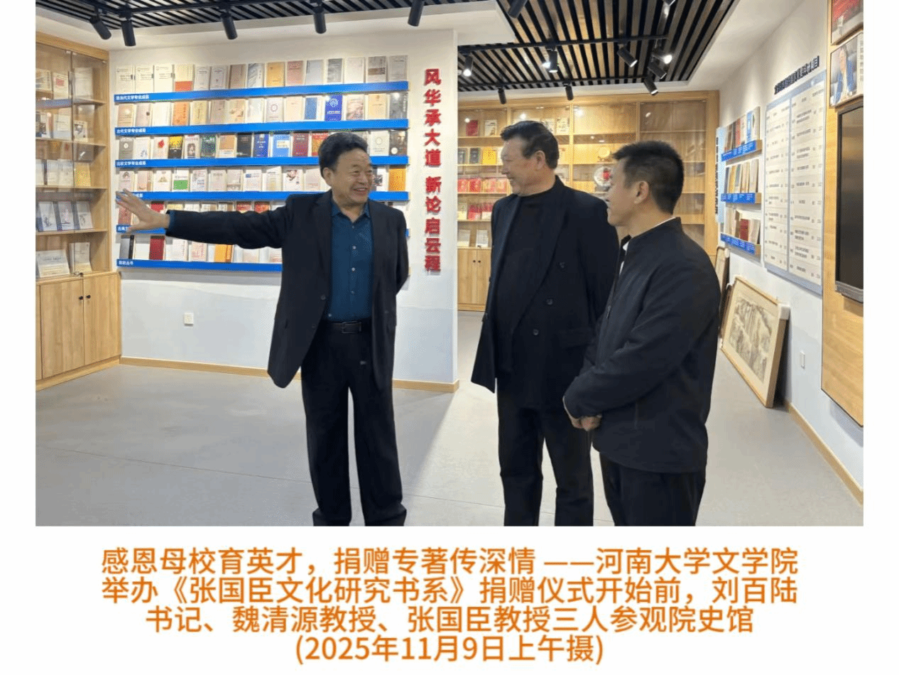2025年11月9日上午,河南大学文学院在A209会议室隆重举行《张国臣文化研究书系》捐赠仪式暨学术研讨会。河南大学武术学院教授、硕士生导师张国臣博士向文学院捐赠了新著。文学院副院长王科主持会议,院史馆馆长魏清源教授接受捐赠,院党委书记刘百陆、副处级组织员王建国参加活动。