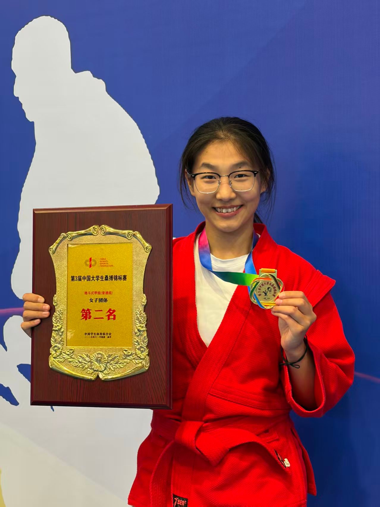 我院2022级本科生郭明月奋力拼搏、过关斩将,凭借强劲的对抗实力脱颖而出,斩获第三届中国大学生桑搏锦标赛格斗式桑搏甲组59公斤级金牌。