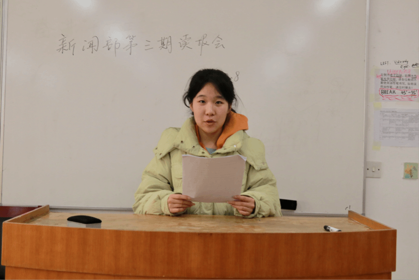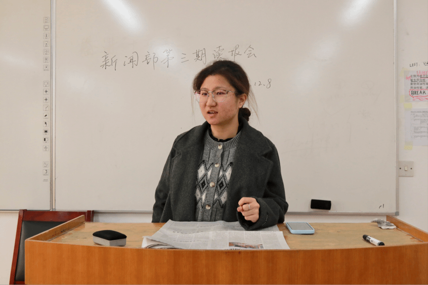 为提升学生理论素养与新闻业务能力,12月8日中午,文学院新闻部于综合教学楼103教室组织读报学习会。部门全体成员参与,新闻部部长王镡嫣然主持活动。