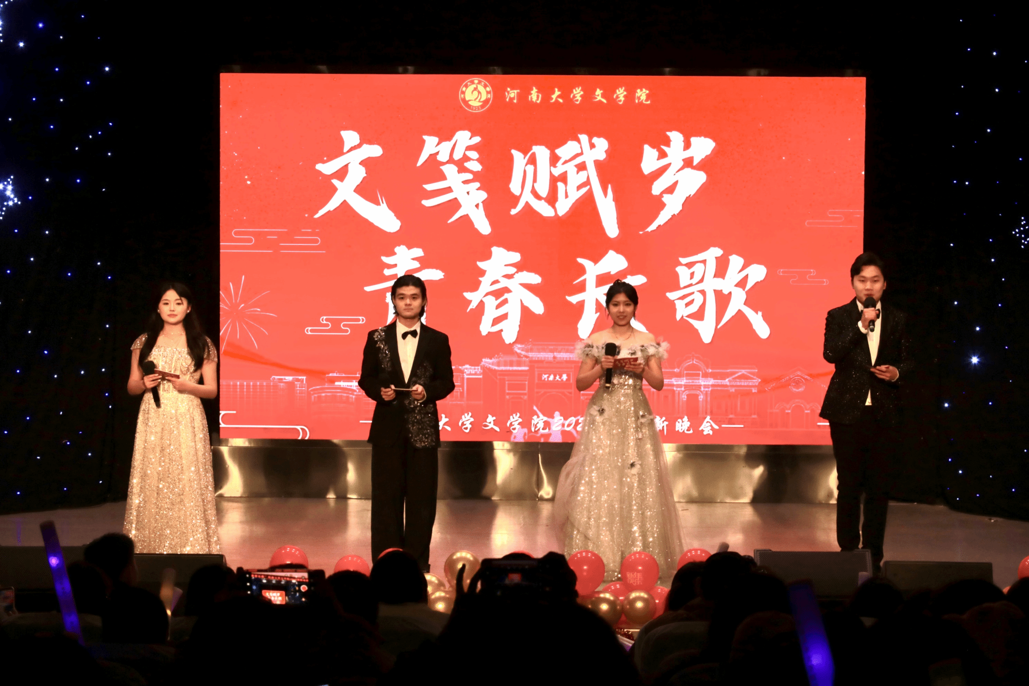 笔绘新章,歌叙青春。12月18日晚,文学院在明伦校区科技馆二楼报告厅举办2026“文笺赋岁,青春长歌”迎新晚会。文学院领导班子、师生及兄弟院系师生代表齐聚现场,晚会由文学院本科生周津竹、张航齐、李卓玮、李宸锐主持。活动现场座无虚席,欢笑声与掌声交织。
