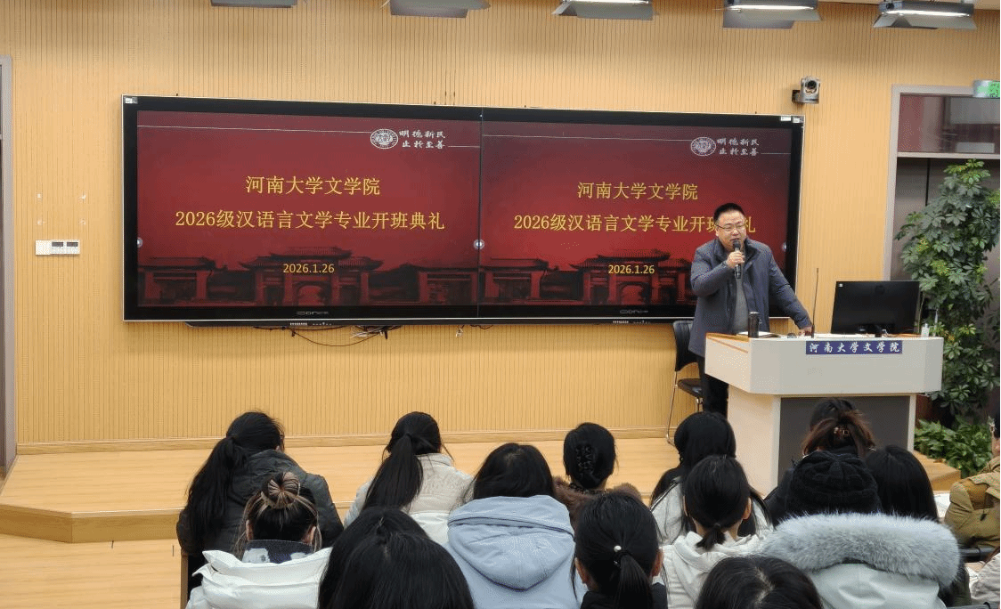 2026年1月26日,河南大学文学院汉语言文学专业2026级函授新生开学典礼在河南大学文学院一楼报告厅隆重举行。文学院院长武新军、继续教育办公室主任杨站军、2026级函授辅导员臧志远出席典礼,来自各地的函授新生齐聚一堂,共同开启求学新篇。本次典礼由杨站军主持。
