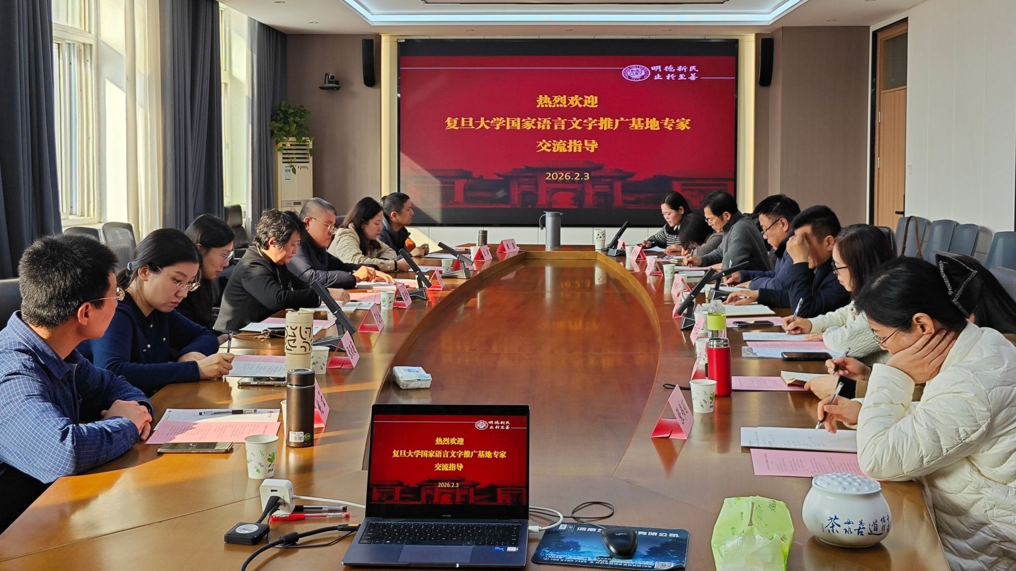 鲁冰汇报了河南大学国家语言文字推广基地的申报背景、组织架构和初步成效,包括承担国家通用语言文字能力提升培训、开展“声呐行动”品牌活动、建设语言文字数字化实验室等工作,同时坦诚指出基地在规范化运营和特色品牌打造方面的不足,希望与复旦大学建立常态化交流合作机制。