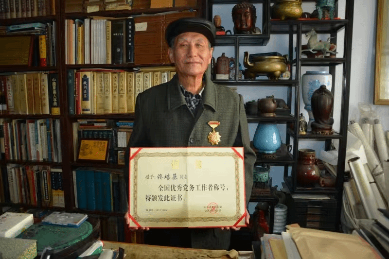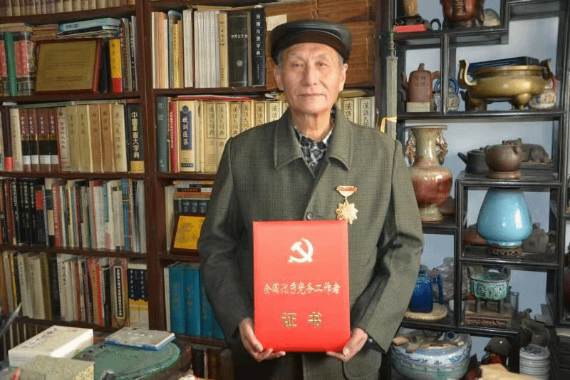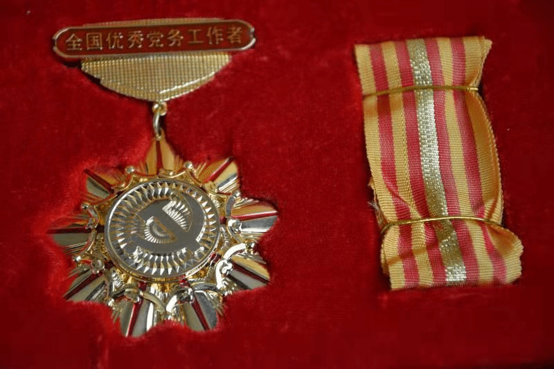[屏幕上出现佟培基彩色照片和“全国优秀党务工作者”奖牌照片照片。