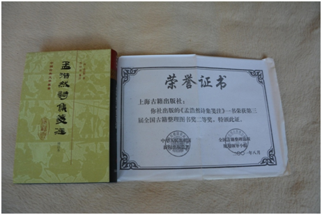 [屏幕上打出字幕:2000年6月,被认为孟浩然作品“最完整最权威之选本”《孟浩然诗集笺注》,由上海古籍出版社出版面世。2001年,这部著作在新闻出版署评选的“全国古籍整理图书奖”评选中荣获二等奖。2013年8月,这部著作入选原国家新闻出版广电总局、全国古籍整理规划领导小组首届面向全国推荐的91种优秀古籍整理图书。